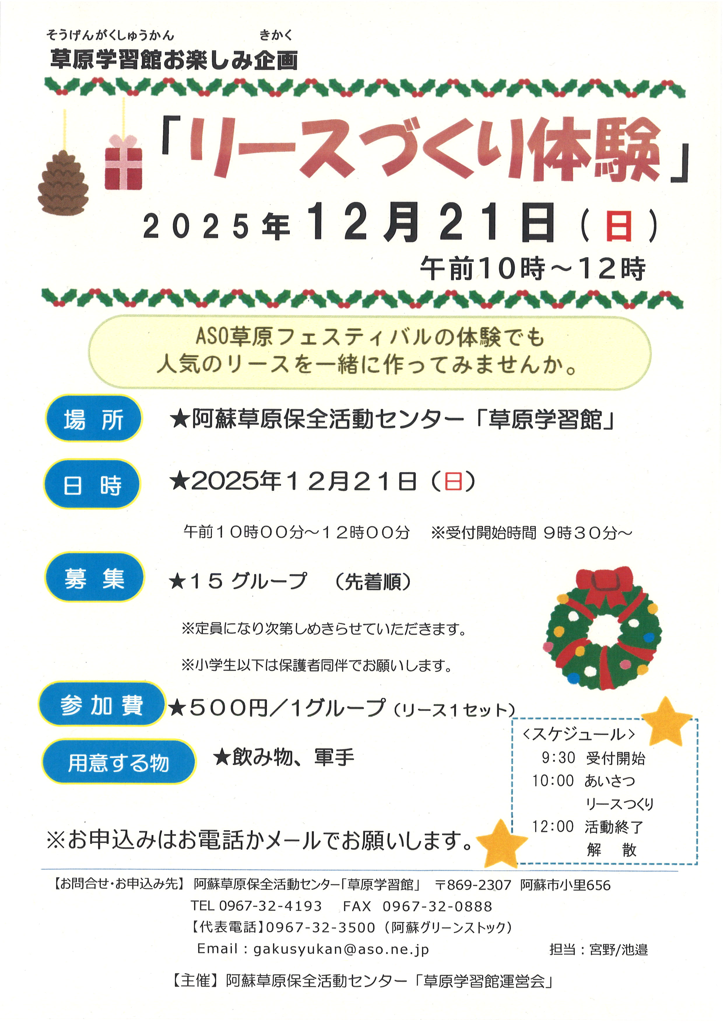 草原学習館では12月21日(日)に、お楽しみ企画「リースつくり」を実施いたします。