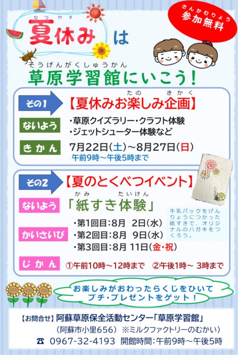 夏本番の8月ですね~。 草原学習館では、夏休み期間中(~8月27日まで)、夏休みお楽しみ企画を実施中です。 今年は、紙すき体験も、8月2日、8月9日、8月11日の3日実施いたします。 詳しくは、以下のチ...