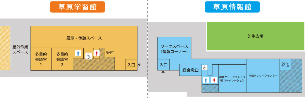 | 阿蘇の草原を知り、学ぶための展示コーナーや多目的会議室などを備え、草原環境学習をサポートします。また、野焼き支援ボランティアなど草原保全・再生のための活動を進める拠点にもなります。 | 阿蘇の草原を学び、楽しむための、相談窓口が開かれています。草原を管理する地域の人々や関係機関・関係団体などとも連携し、観光と農畜産業をつなぐ拠点として草原利活用のニーズにお応えします。 |
