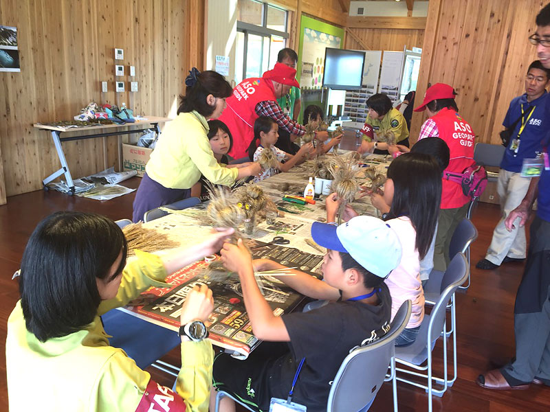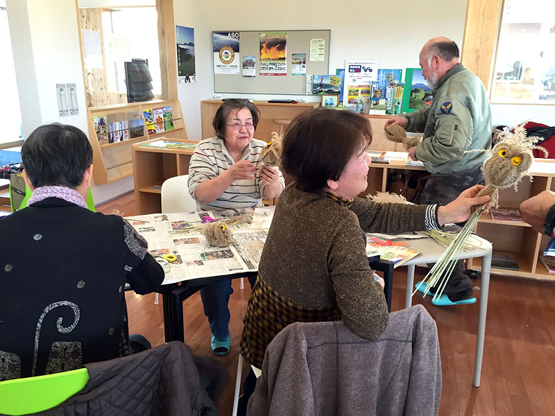 草原のススキを使ったクラフト体験はいかがですか! ミニホウキづくり、フクロウづくりなどのメニューがあります。また、野焼きで使用する火消棒づくり、そのミニ版(飾り用)ミニ火消棒づくりも体験メニューとしてご用意しています。