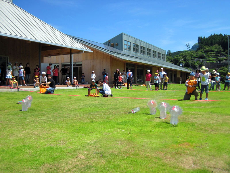 野焼きで使うジェットシューター(背負い式噴霧器)を実際に体験します。あらかじめ設置した的を狙うチーム戦も可能です。あわせて野焼きについて学びましょう。